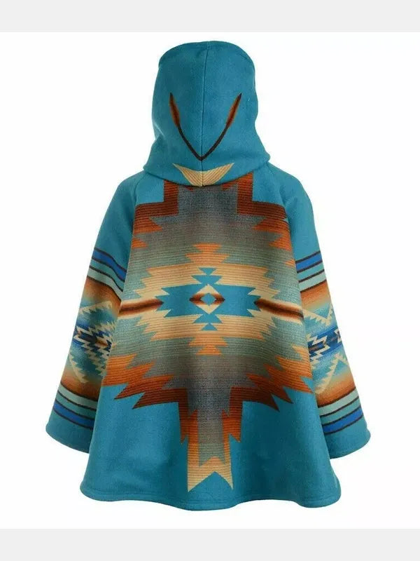 Inspired by the bold and iconic style seen in Yellowstone, this Beth Dutton Blue Poncho Coat is a statement piece that blends Western heritage with modern elegance. Crafted in a rich turquoise blue tone, the coat features a striking Native inspired geometric pattern that instantly stands out.